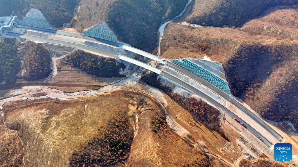 A drone photo taken on Nov. 19, 2024 shows a section of the Lingyuan-Suizhong expressway under construction in northeast China's Liaoning Province. The expressway linking the counties of Lingyuan and Suizhong both in Liaoning, when completed, will be a new passage to the sea for the western part of the province. (Xinhua/Yang Qing)