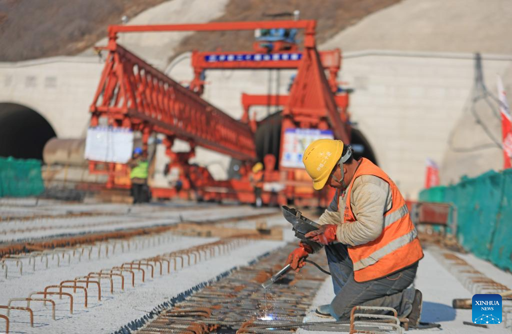 A man performs welding operation on a bridge of the Lingyuan-Suizhong expressway in northeast China's Liaoning Province, Nov. 19, 2024. The expressway linking the counties of Lingyuan and Suizhong both in Liaoning, when completed, will be a new passage to the sea for the western part of the province. (Xinhua/Yang Qing)