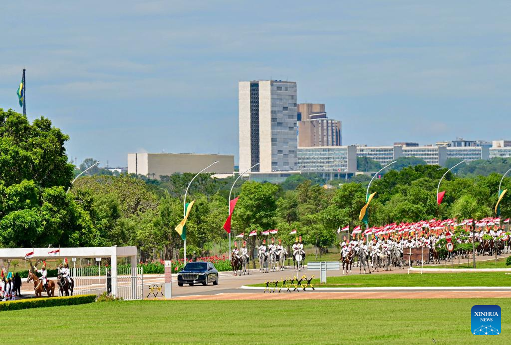 Brazilian President Luiz Inacio Lula da Silva and his wife Rosangela da Silva warmly welcome Chinese President Xi Jinping and hold a grand welcome ceremony for Xi, prior to the talks between Xi and Lula, in Brasilia, Brazil, Nov. 20, 2024. Xi on Wednesday held talks with Lula in Brasilia. (Xinhua/Li Xueren)
