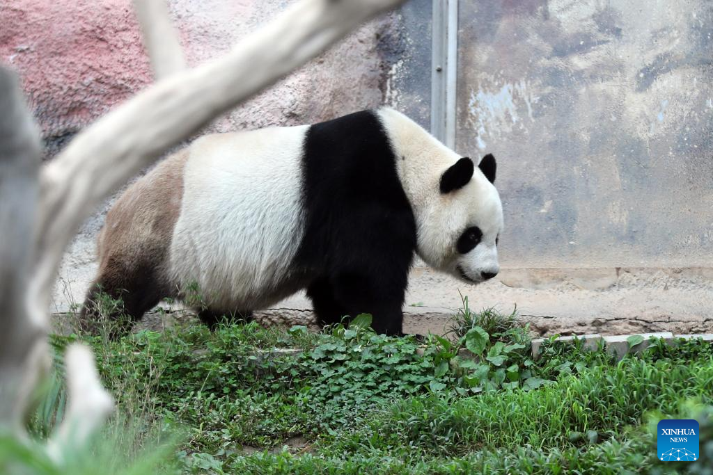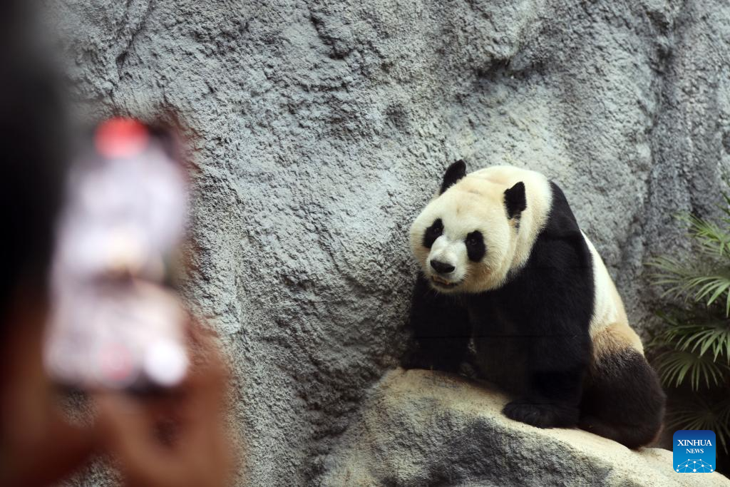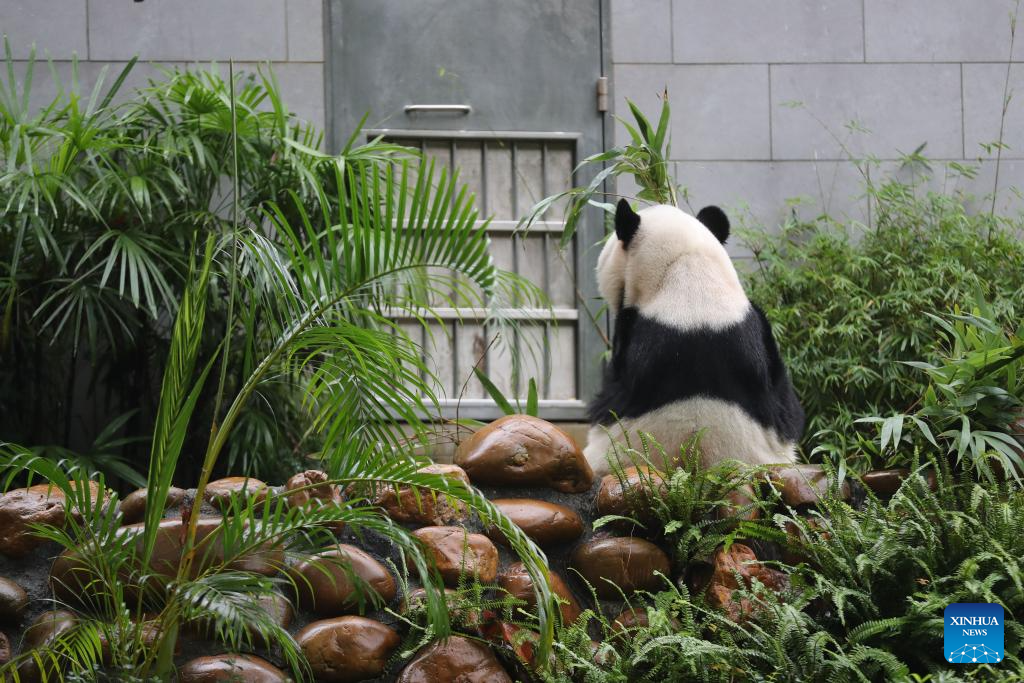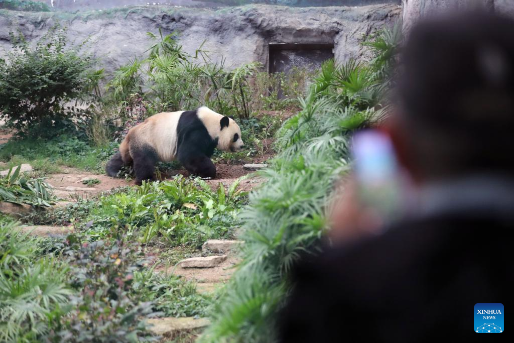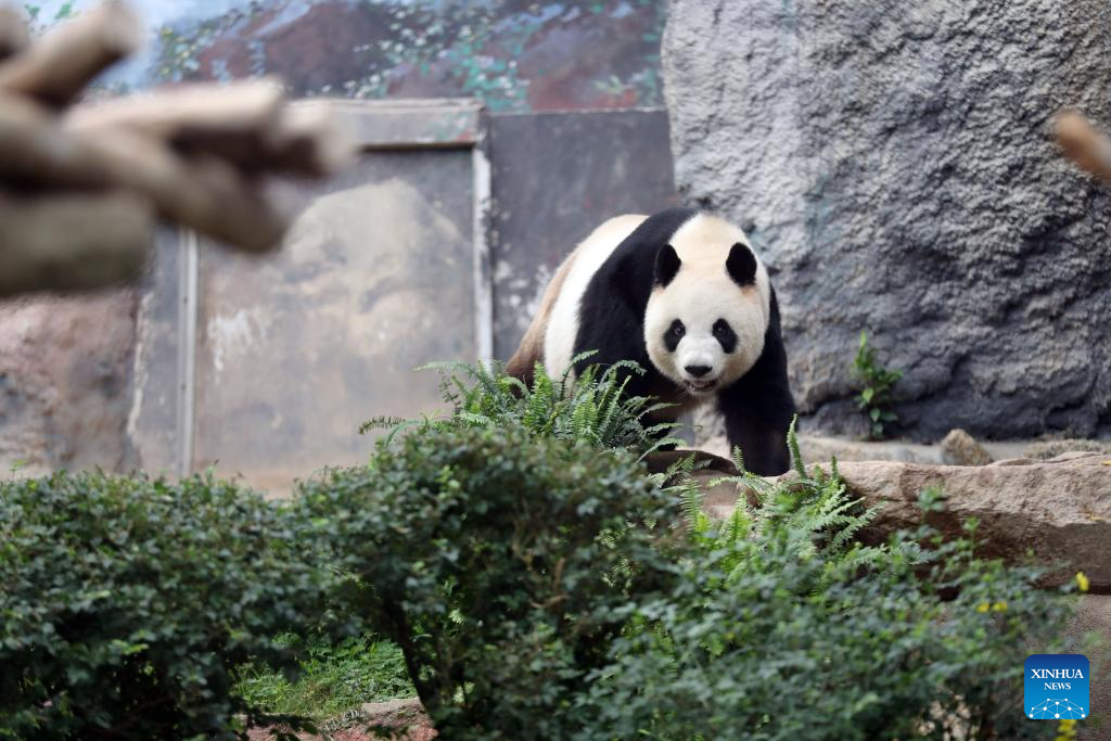 Giant panda Xinxin is pictured in Macao, south China, Nov. 20, 2024. A pair of giant pandas Kaikai and Xinxin were chosen from Chengdu Research Base of Giant Panda Breeding in southwest China's Sichuan Province as a gift of the central government to Macao Special Administrative Region in 2015. They gave birth to twin brothers Jianjian and Kangkang here in 2016. The panda family is now living a happy and leisured life. (Xinhua/Wang Yiliang)