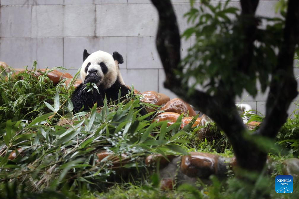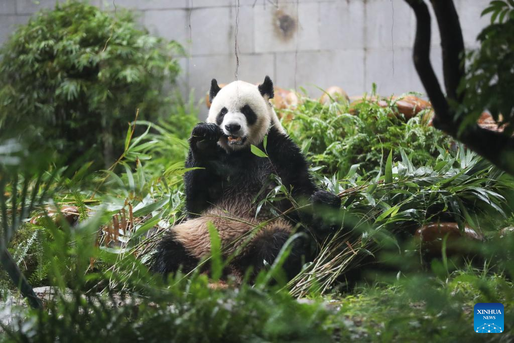 Giant panda Kangkang eats bamboo in Macao, south China, Nov. 20, 2024. A pair of giant pandas Kaikai and Xinxin were chosen from Chengdu Research Base of Giant Panda Breeding in southwest China's Sichuan Province as a gift of the central government to Macao Special Administrative Region in 2015. They gave birth to twin brothers Jianjian and Kangkang here in 2016. The panda family is now living a happy and leisured life. (Xinhua/Wang Yiliang)
