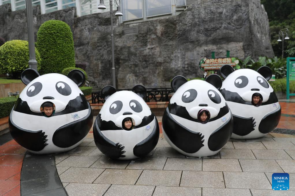 Children pose for a photo inside giant panda-shaped decorations in Macao, south China, Nov. 20, 2024. A pair of giant pandas Kaikai and Xinxin were chosen from Chengdu Research Base of Giant Panda Breeding in southwest China's Sichuan Province as a gift of the central government to Macao Special Administrative Region in 2015. They gave birth to twin brothers Jianjian and Kangkang here in 2016. The panda family is now living a happy and leisured life. (Xinhua/Wang Yiliang)