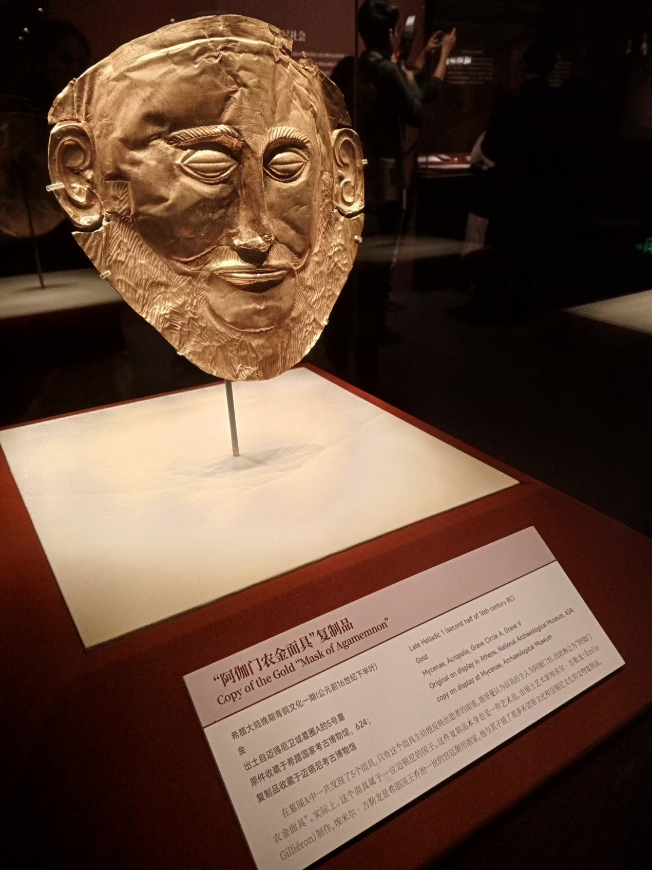 The copy of the Golden "Mask of Agamemnon" among the artifacts presented in the exhibition "Greeks: Agamemnon to Alexander the Great" at the Beijing Capital Museum, Nov. 20, 2024. (Photo/People's Daily Online)