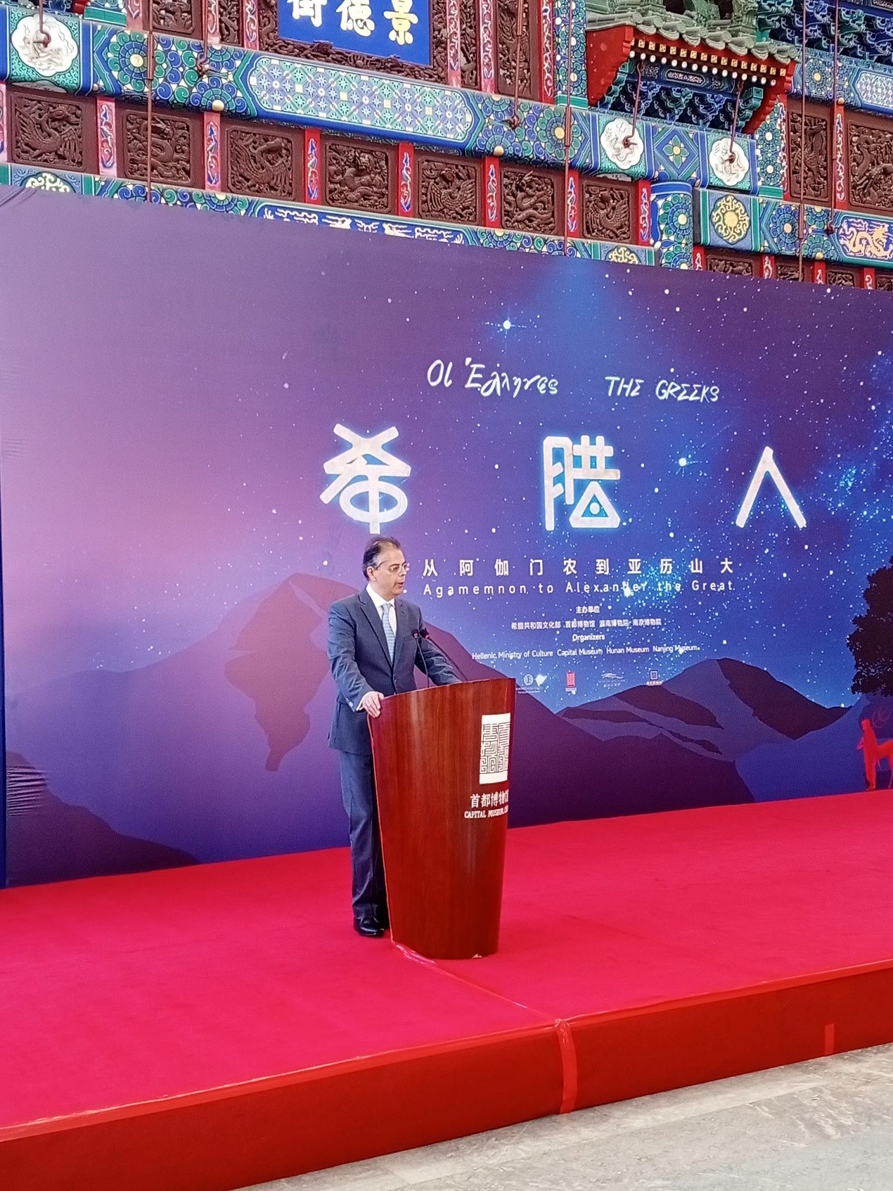 Evgenios Kalpyris, ambassador of Greece in China, addresses the audience during the opening ceremony of the exhibition "Greeks: Agamemnon to Alexander the Great" at the Beijing Capital Museum, Nov. 20, 2024. (Photo/People's Daily Online)