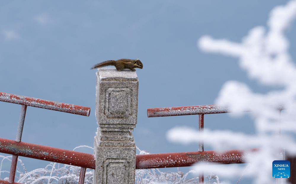 A squirrel is pictured on the summit of Mount Emei, or Jinding in Chinese, in southwest China's Sichuan Province, Nov. 20, 2024. (Xinhua/Jiang Hongjing)
