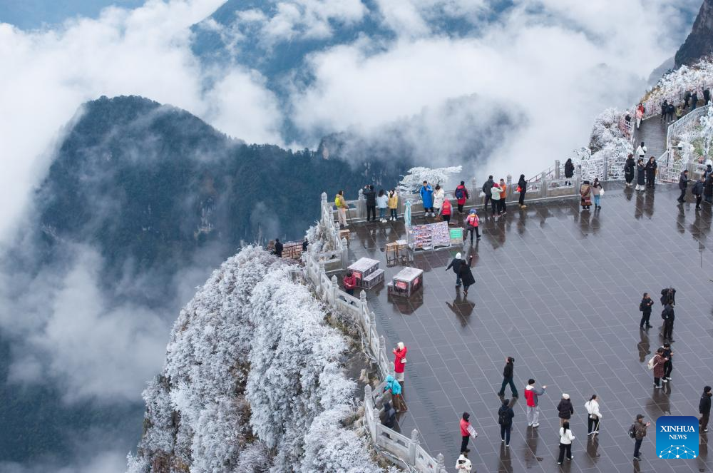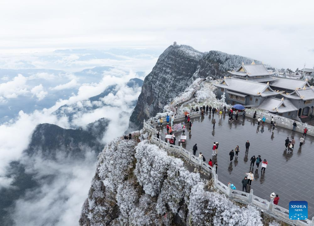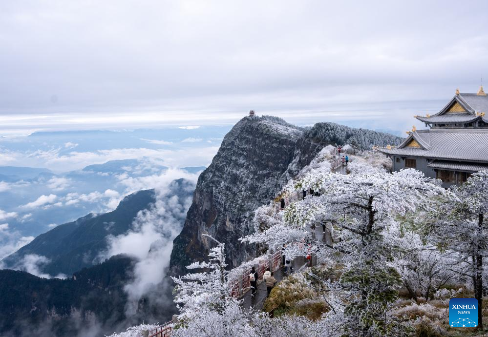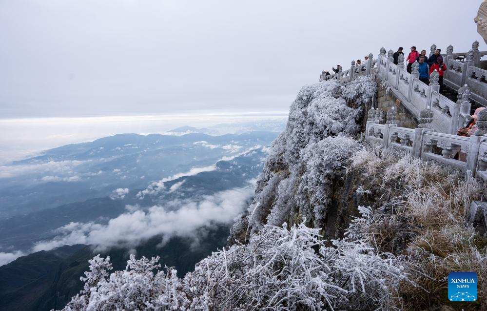 People visit the summit of Mount Emei, or Jinding in Chinese, in southwest China's Sichuan Province, Nov. 20, 2024. (Xinhua/Liu Lianfen)