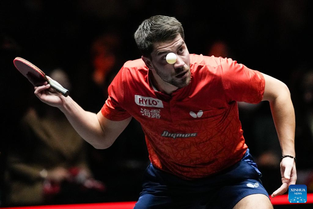 Patrick Franziska serves the ball during the men's singles round of 16 match between Wang Chuqin of China and Patrick Franziska of Germany at World Table Tennis (WTT) Finals Fukuoka 2024 in Kitakyushu, Japan, Nov. 21, 2024. (Xinhua/Zhang Xiaoyu)