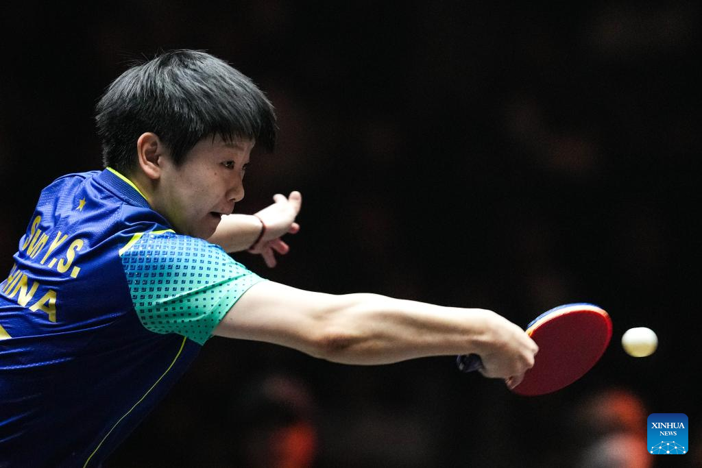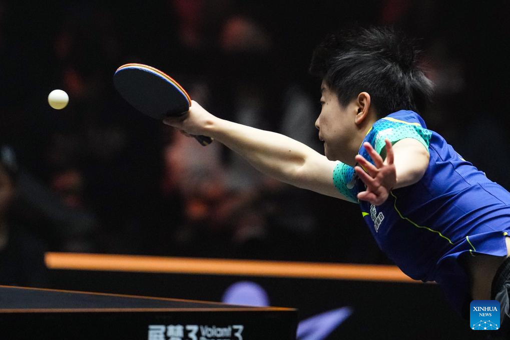 Sun Yingsha of China hits a return during the women's singles round of 16 between Sun Yingsha of China and Chen Xingtong of China at World Table Tennis (WTT) Finals Fukuoka 2024 in Kitakyushu, Japan, on Nov. 21, 2024. (Xinhua/Zhang Xiaoyu)