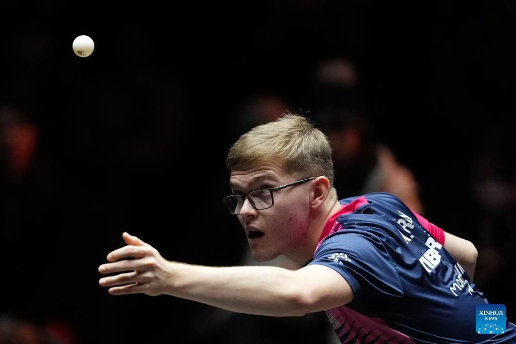 Lin Shidong returns the ball during the men's singles round of 16 between Lin Shidong of China and Alexis Lebrun of France at World Table Tennis (WTT) Finals Fukuoka 2024 in Kitakyushu, Japan, Nov. 21, 2024. (Xinhua/Zhang Xiaoyu)