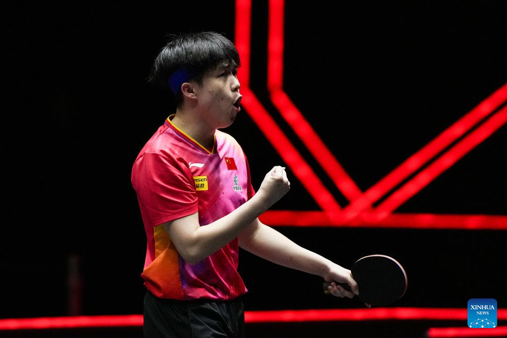 Wang Chuqin celebrates during the men's singles round of 16 match between Wang Chuqin of China and Patrick Franziska of Germany at World Table Tennis (WTT) Finals Fukuoka 2024 in Kitakyushu, Japan, Nov. 21, 2024. (Xinhua/Zhang Xiaoyu)