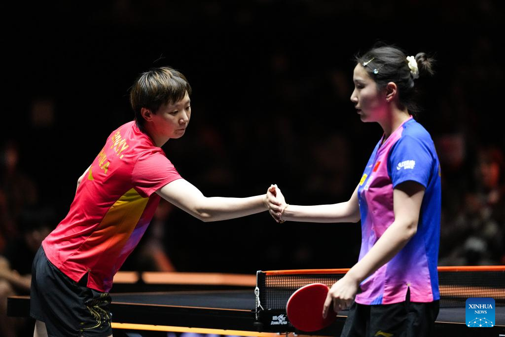 Wang Manyu (L) of China and Qian Tianyi of China greet each other after their women's singles quarterfinal at World Table Tennis (WTT) Finals Fukuoka 2024 in Kitakyushu, Japan, on Nov. 22, 2024. (Xinhua/Zhang Xiaoyu)