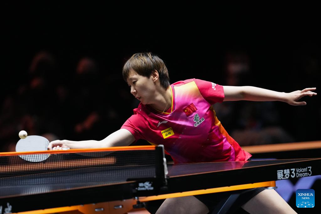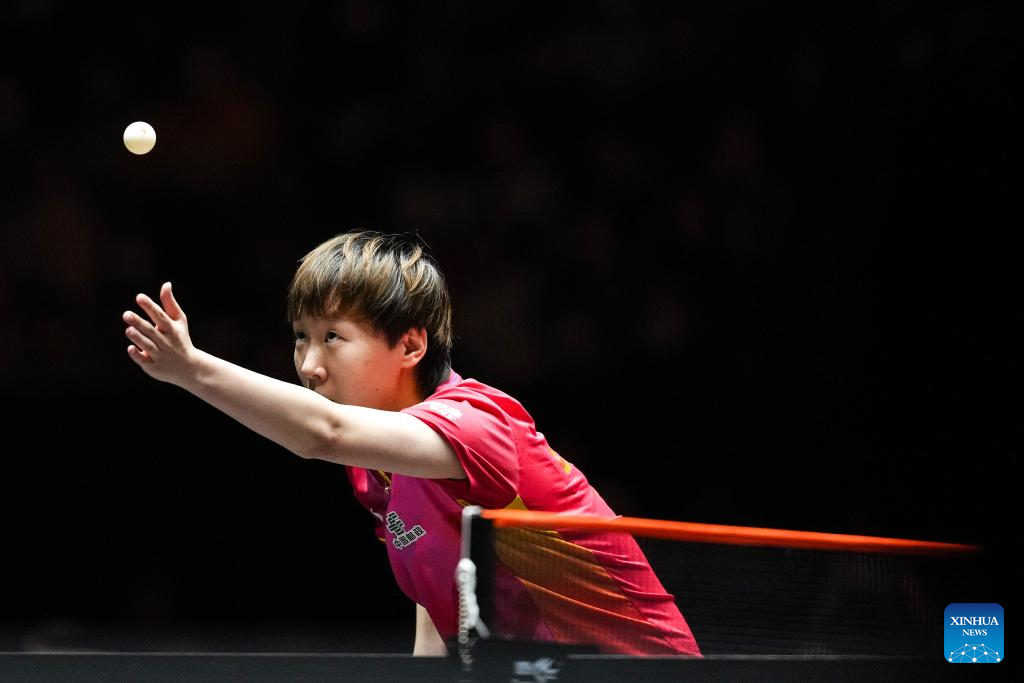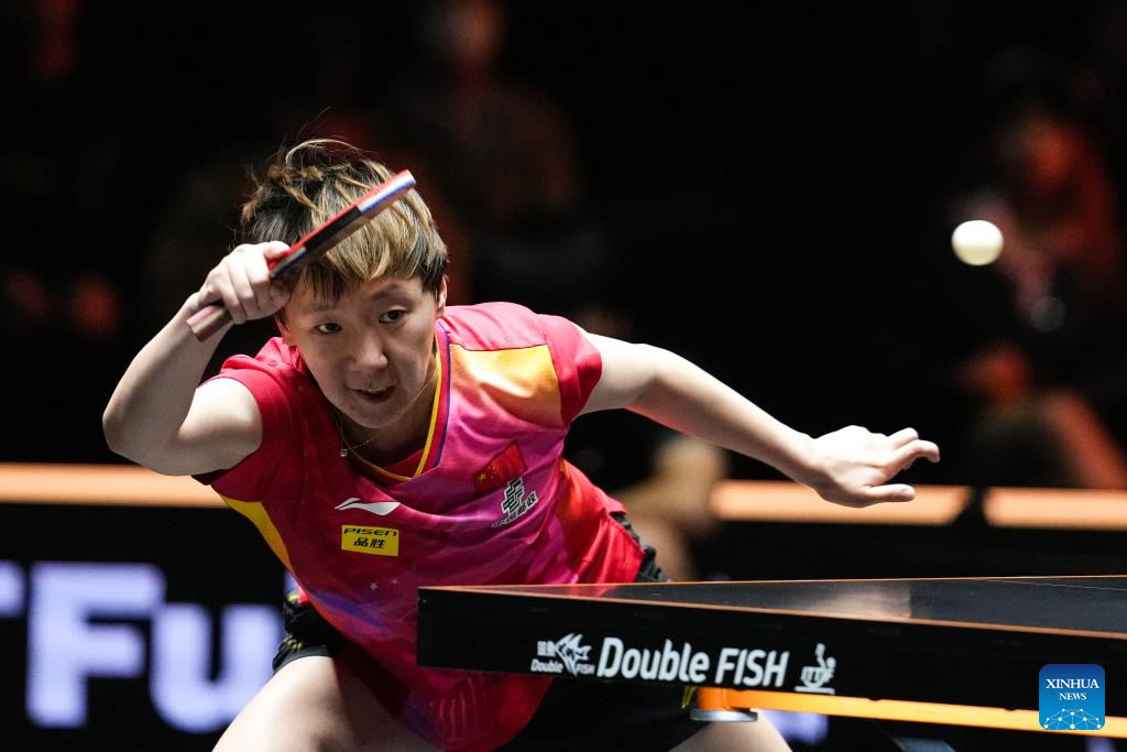 Wang Manyu of China hits a return during the women's singles quarterfinal against Qian Tianyi of China at World Table Tennis (WTT) Finals Fukuoka 2024 in Kitakyushu, Japan, on Nov. 22, 2024. (Xinhua/Zhang Xiaoyu)