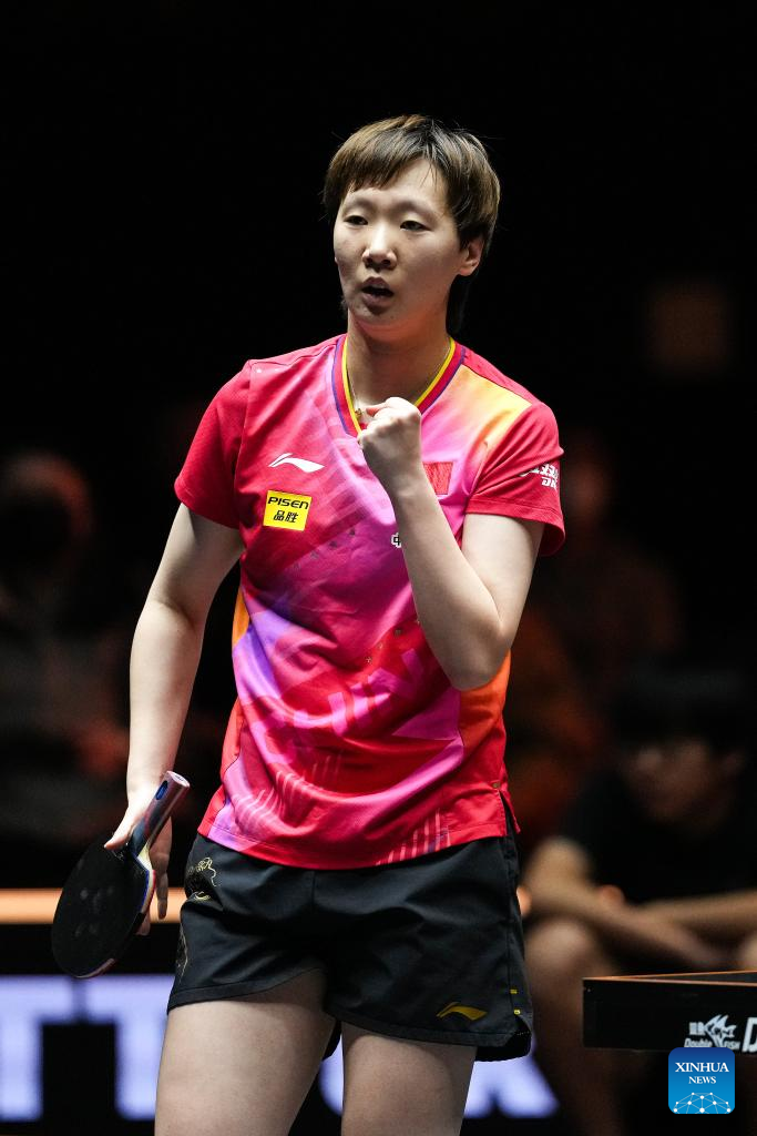 Wang Manyu of China reacts during the women's singles quarterfinal against Qian Tianyi of China at World Table Tennis (WTT) Finals Fukuoka 2024 in Kitakyushu, Japan, on Nov. 22, 2024. (Xinhua/Zhang Xiaoyu)