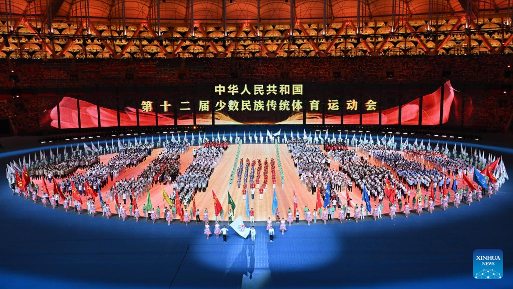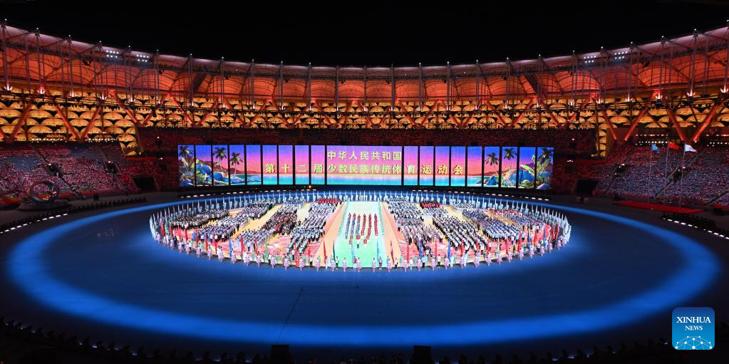 This photo taken on Nov. 22, 2024 shows the opening ceremony of the 12th National Traditional Games of Ethnic Minorities of the People's Republic of China in Sanya, south China's Hainan Province. (Xinhua/Yang Guanyu)