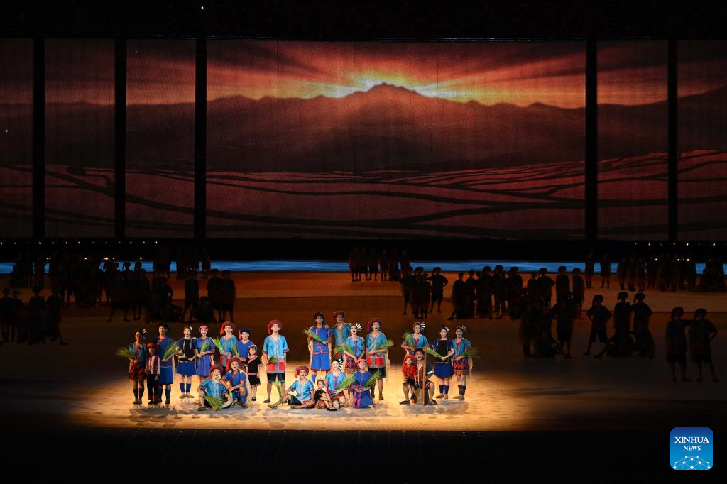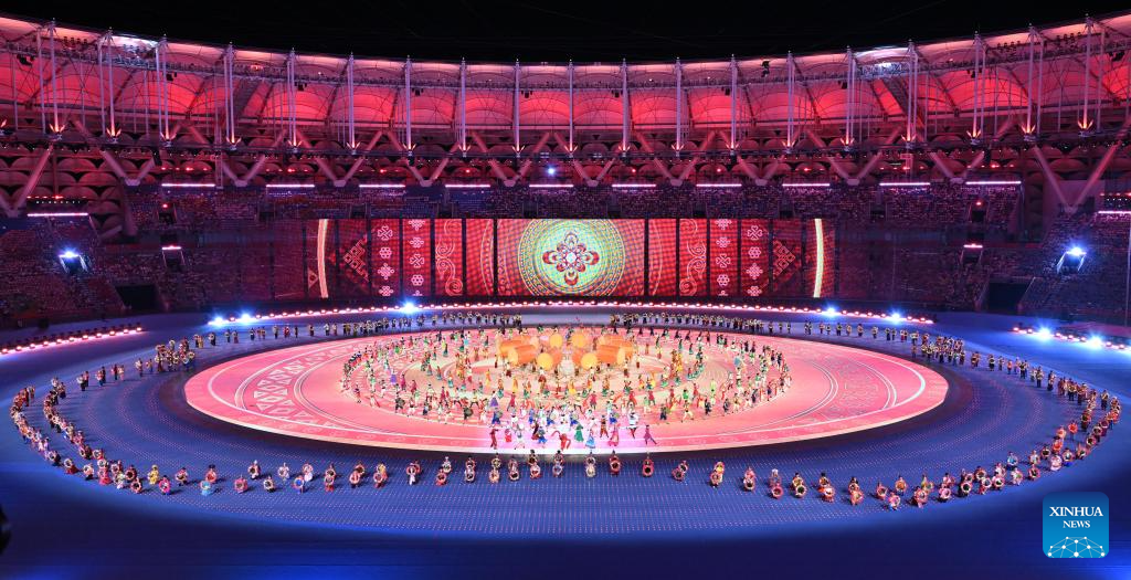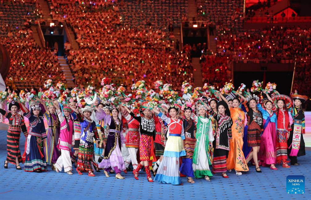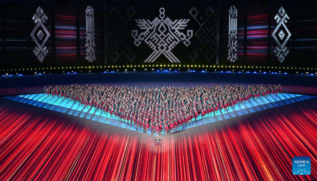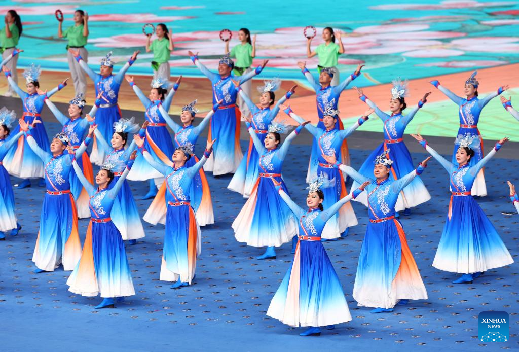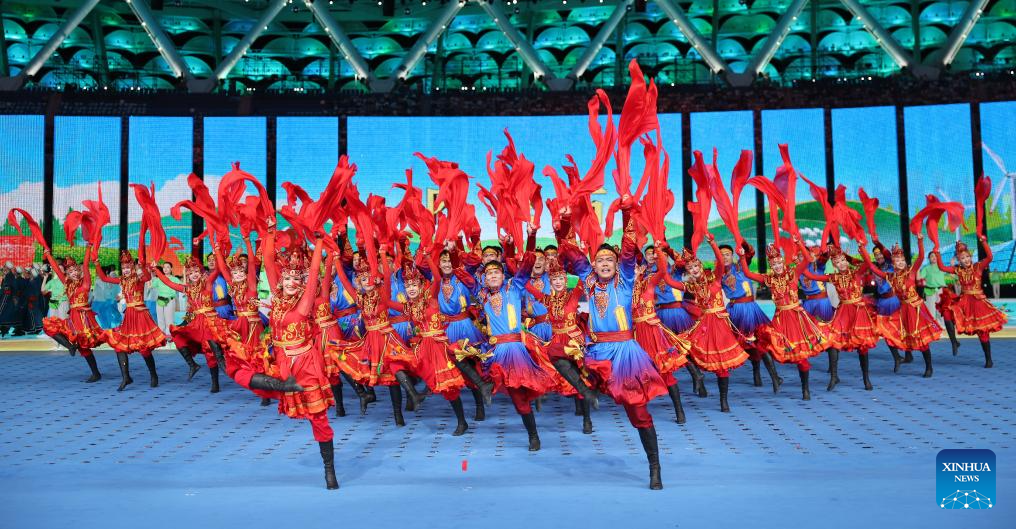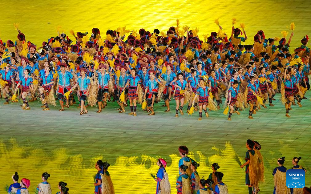 Artists perform during the opening ceremony of the 12th National Traditional Games of Ethnic Minorities of the People's Republic of China in Sanya, south China's Hainan Province, Nov. 22, 2024. (Xinhua/Jigme Dorji)