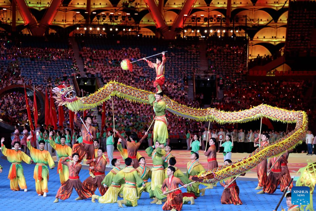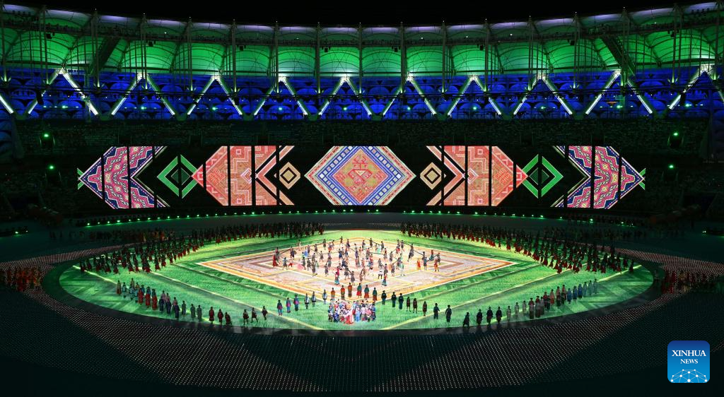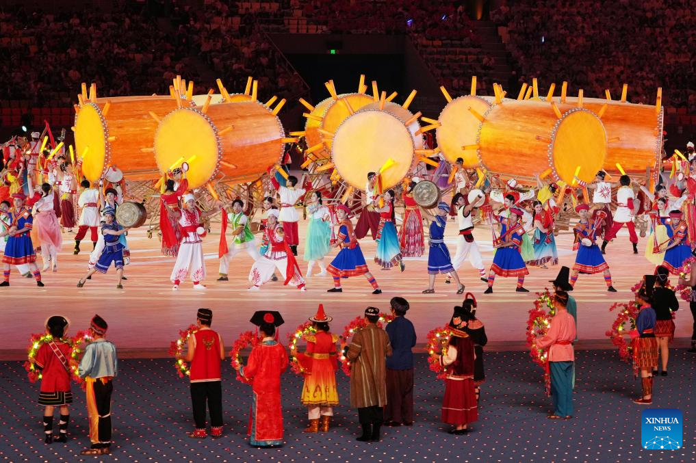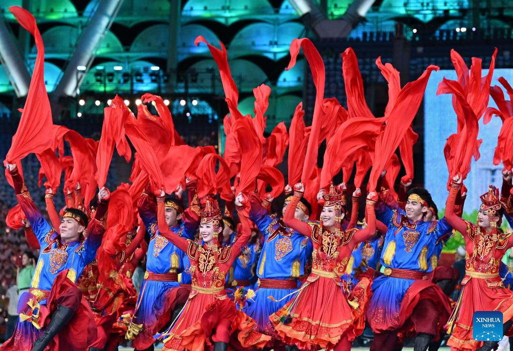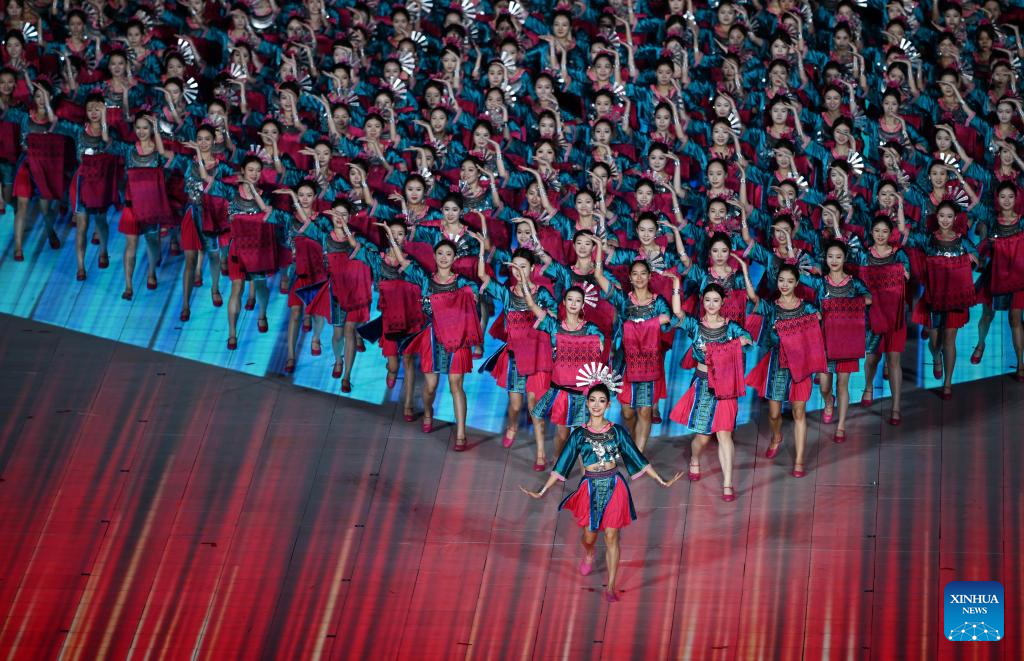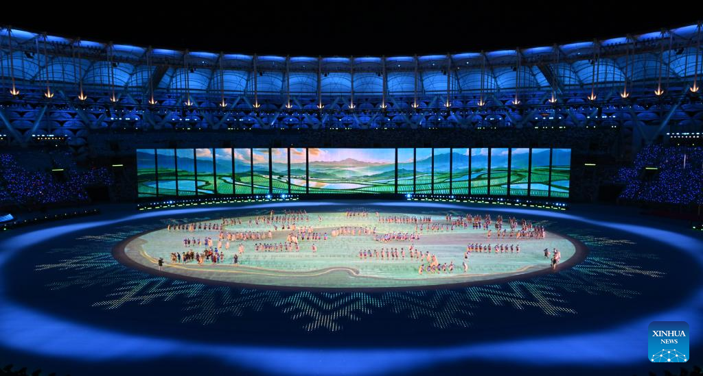 Artists perform during the opening ceremony of the 12th National Traditional Games of Ethnic Minorities of the People's Republic of China in Sanya, south China's Hainan Province, Nov. 22, 2024. (Xinhua/Jigme Dorji)