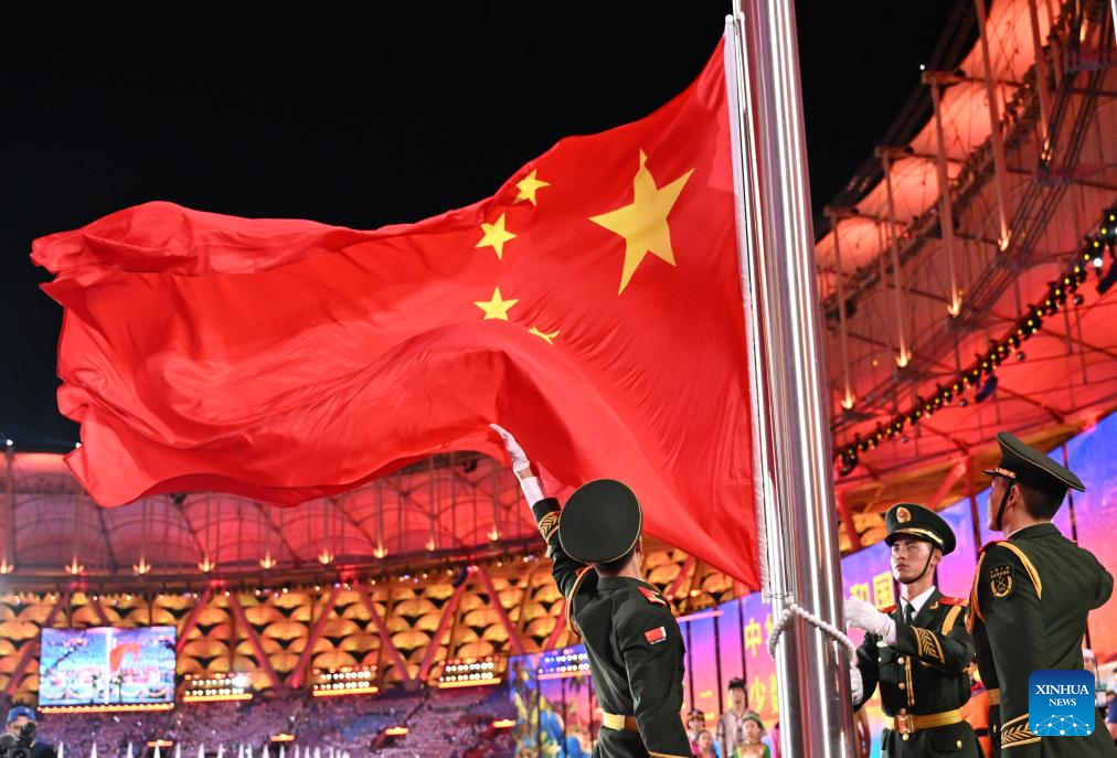 The Chinese national flag is raised during the opening ceremony of the 12th National Traditional Games of Ethnic Minorities of the People's Republic of China in Sanya, south China's Hainan Province, Nov. 22, 2024. (Xinhua/Sun Fanyue)