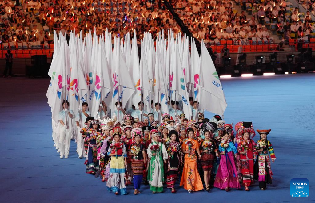 Artists perform while flag bearers carrying the flags of 12th National Traditional Games of Ethnic Minorities of the People's Republic of China into the stadium during the opening ceremony of the 12th National Traditional Games of Ethnic Minorities of the People's Republic of China in Sanya, south China's Hainan Province, Nov. 22, 2024. (Xinhua/Jigme Dorji)