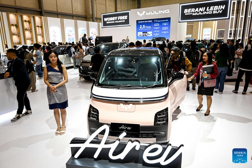 Visitors view vehicles displayed at the booth of Chinese auto brand Wuling during opening of Gaikindo Jakarta Auto Week (GJAW) 2024 in Tangerang, Banten Province, Indonesia, Nov. 22, 2024. The auto show is held here from Nov. 22 to Dec. 1. (Xinhua/Agung Kuncahya B.)