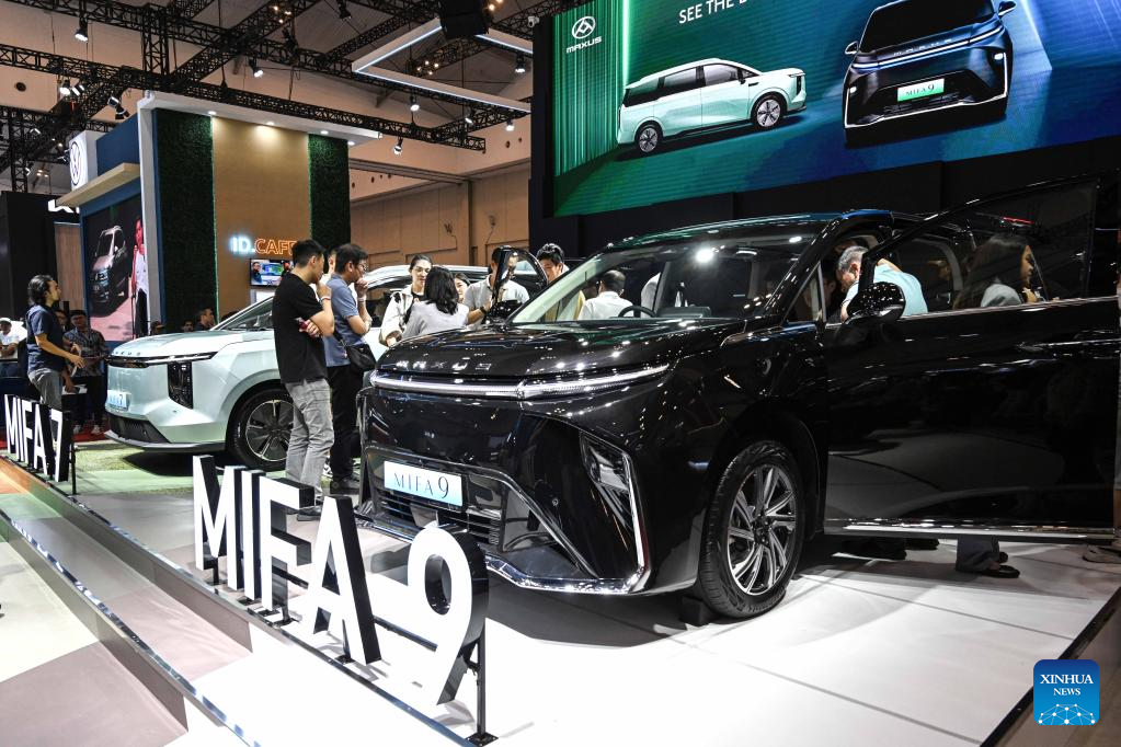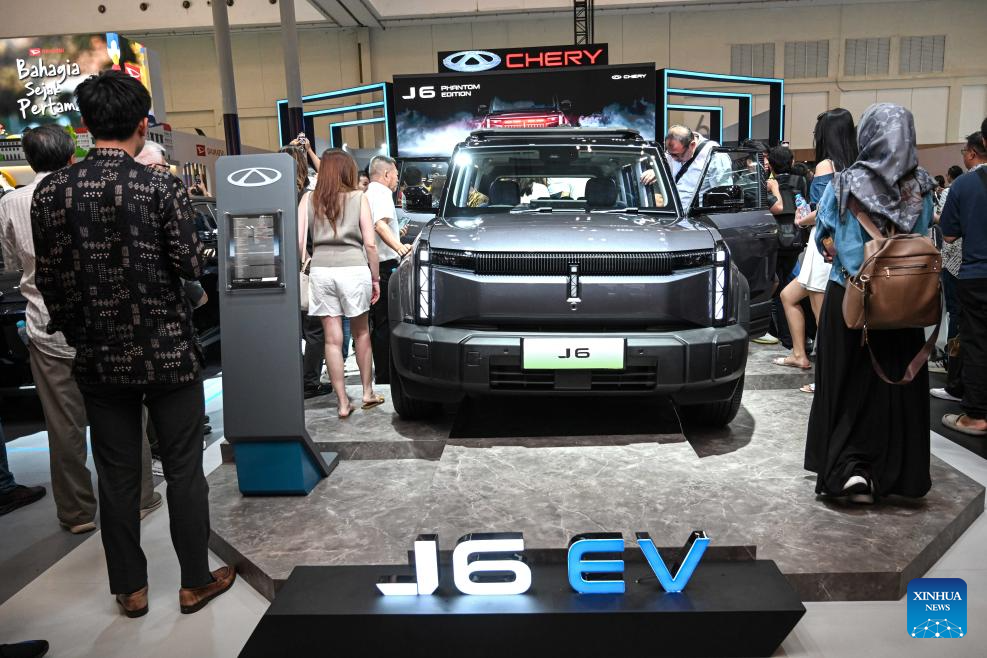 Visitors view a vehicle displayed at the booth of Chinese auto brand Chery during opening of Gaikindo Jakarta Auto Week (GJAW) 2024 in Tangerang, Banten Province, Indonesia, Nov. 22, 2024. The auto show is held here from Nov. 22 to Dec. 1. (Xinhua/Agung Kuncahya B.)