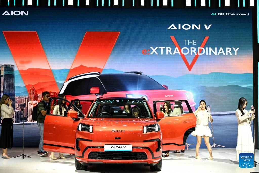 Cyberspace influencers are pictured around a vehicle displayed at the booth of Chinese auto brand Aion during opening of Gaikindo Jakarta Auto Week (GJAW) 2024 in Tangerang, Banten Province, Indonesia, Nov. 22, 2024. The auto show is held here from Nov. 22 to Dec. 1. (Xinhua/Agung Kuncahya B.)