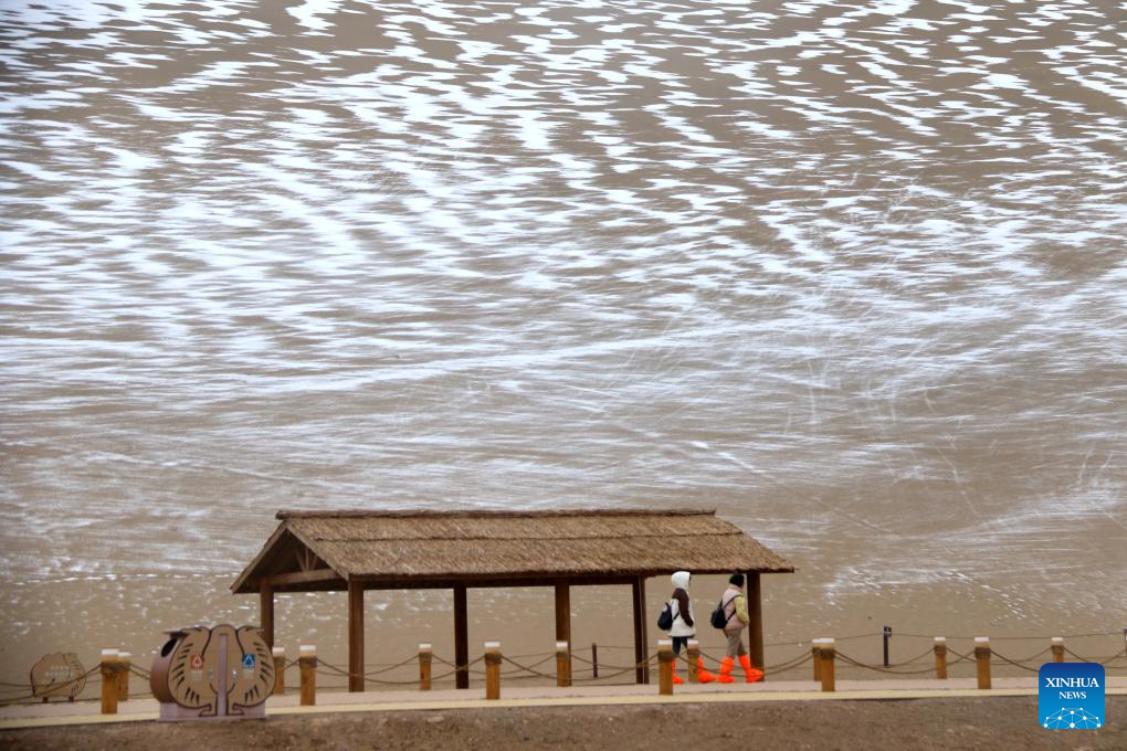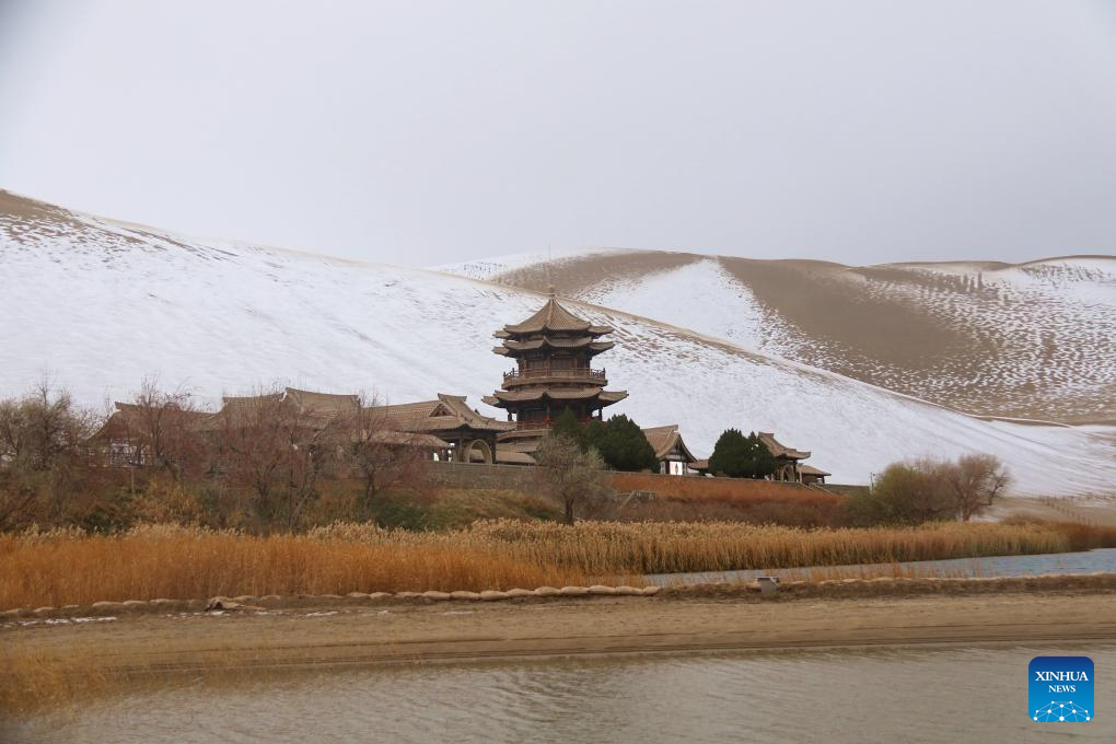 This photo taken on Nov. 23, 2024 shows snow scenery of the Mingsha Mountain and Crescent Spring scenic spot in Dunhuang, northwest China's Gansu Province. (Photo by Zhang Xiaoliang/Xinhua)