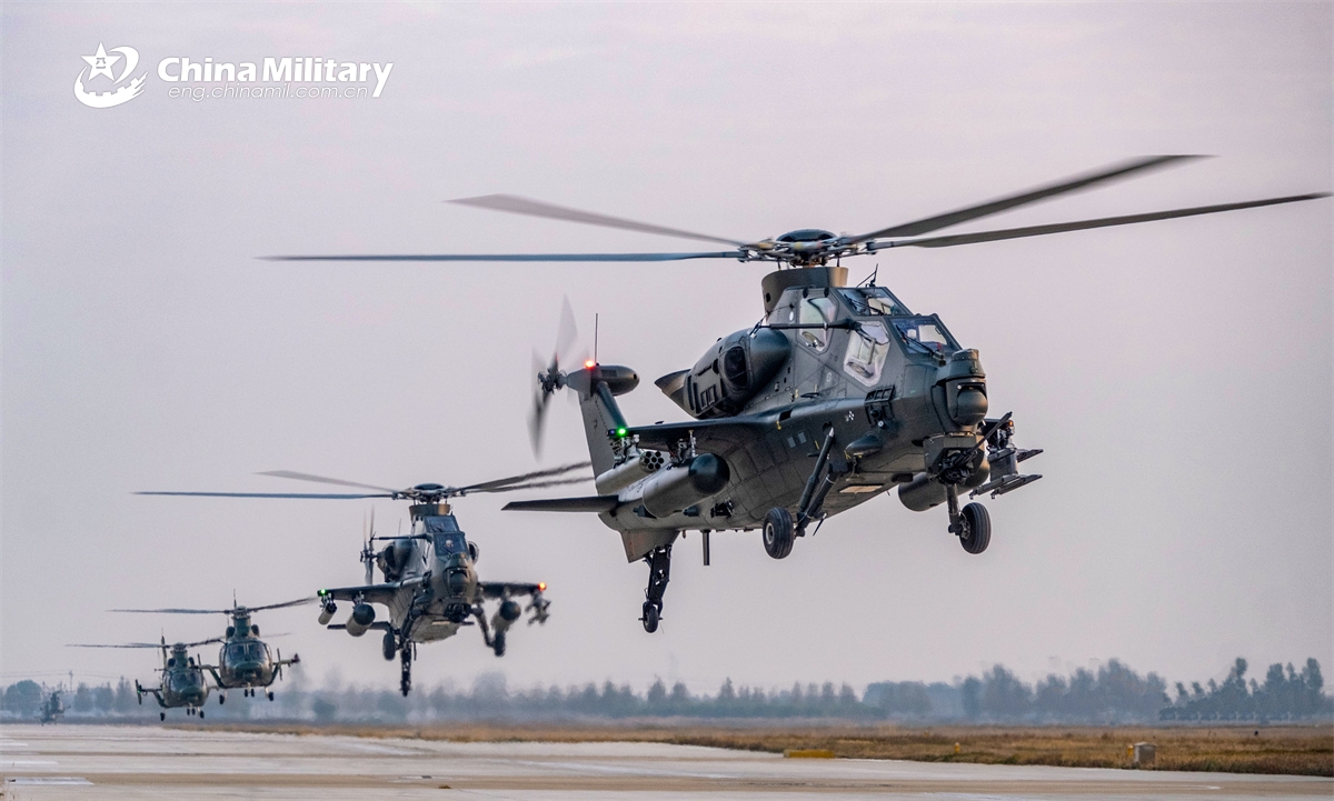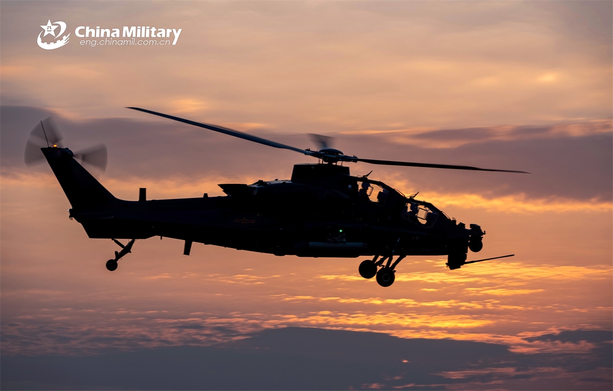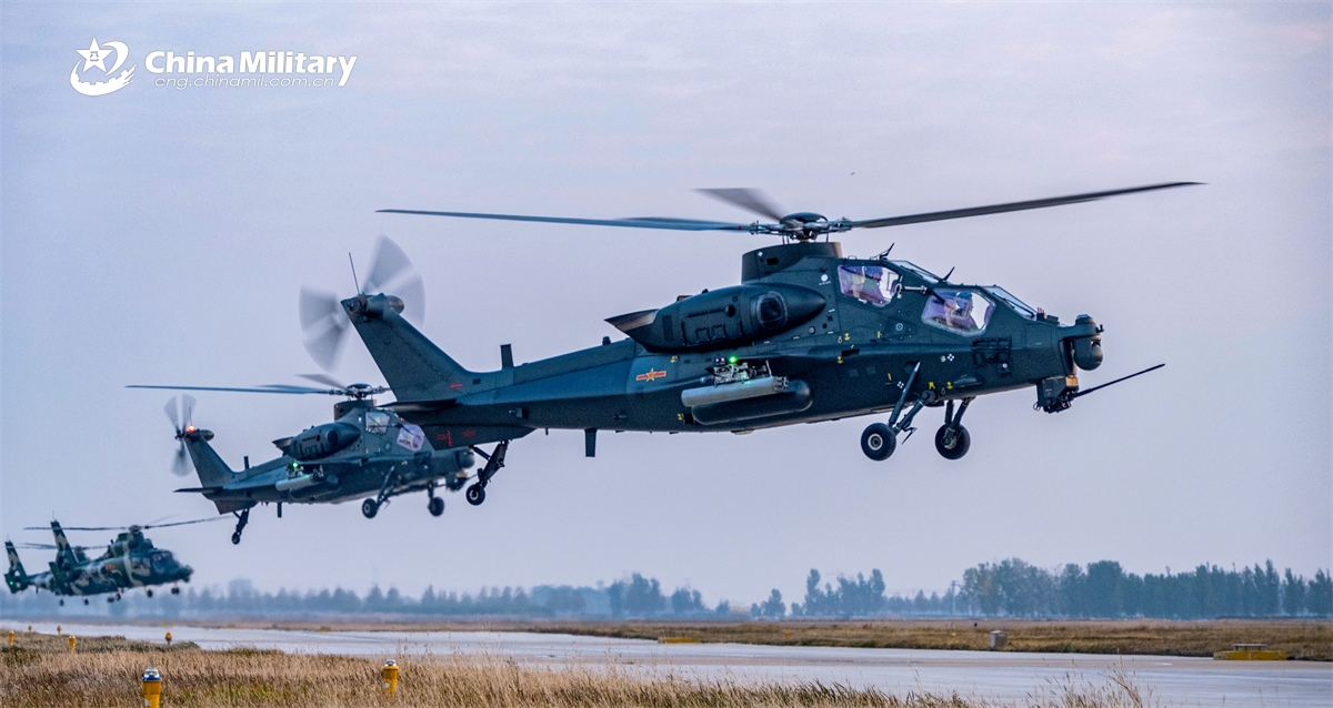 A WZ-10 attack helicopter attached to a brigade under the Chinese PLA 80th Group Army flies towards the designated airspace during a flight training exercise on November 7, 2024. (eng.chinamil.com.cn/Photo by Liu Yuchen)