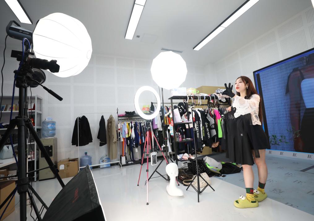 A salesperson hosts a live-streaming session to sell swimming suits at a swimwear company in Huludao, northeast China's Liaoning Province, on April 18, 2024. (Xinhua/Yang Qing)