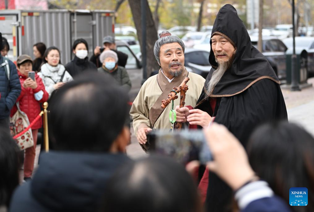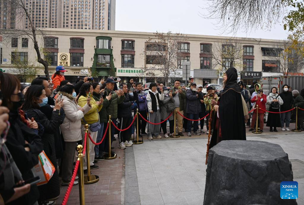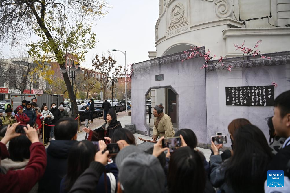 Actors perform drama "the Phoenix hair clip" in a street in Tianjin, north China, Nov. 24, 2024. "The Phoenix hair clip" is a poem of famous poet Lu You in China's Song Dynasty (960-1279), describing his real tragic love story that had been adapted by artists into many versions of dramas.