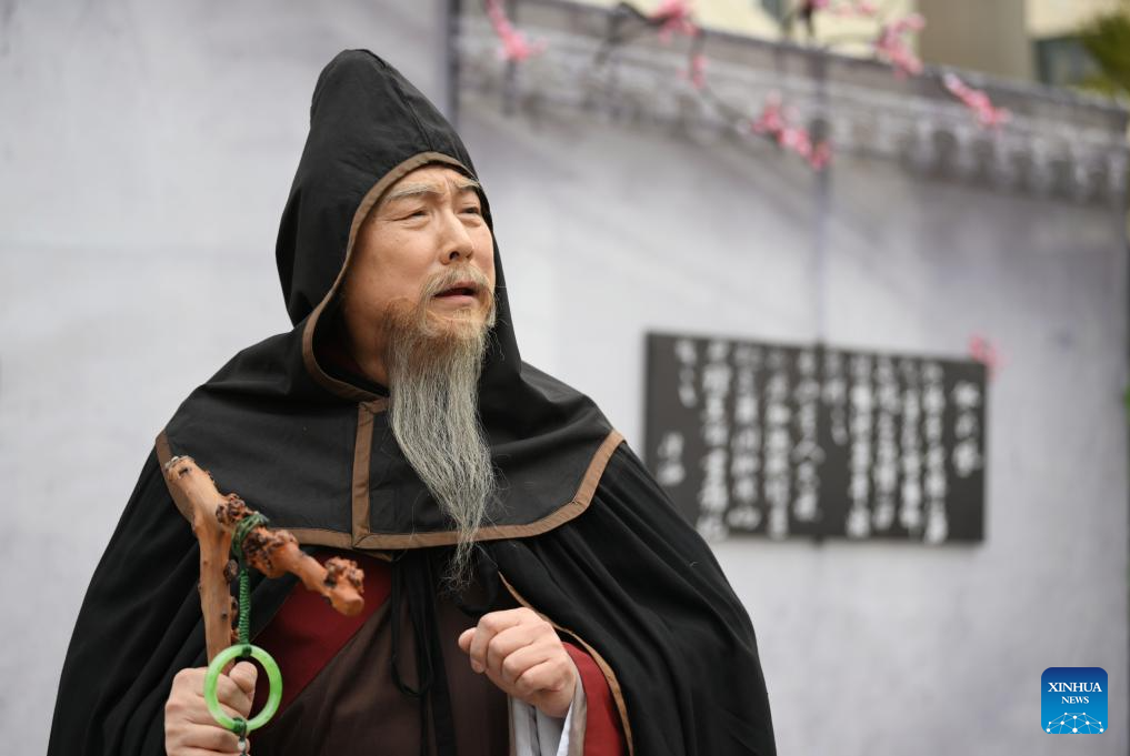 An actor performs drama "the Phoenix hair clip" in a street in Tianjin, north China, Nov. 24, 2024. "The Phoenix hair clip" is a poem of famous poet Lu You in China's Song Dynasty (960-1279), describing his real tragic love story that had been adapted by artists into many versions of dramas.