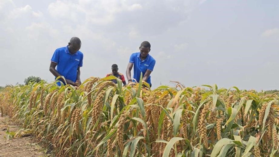 Local workers harvest foxtail millet in the China-Uganda Agricultural Cooperation Industrial Park in Uganda. (Photo/Long Wenjing)