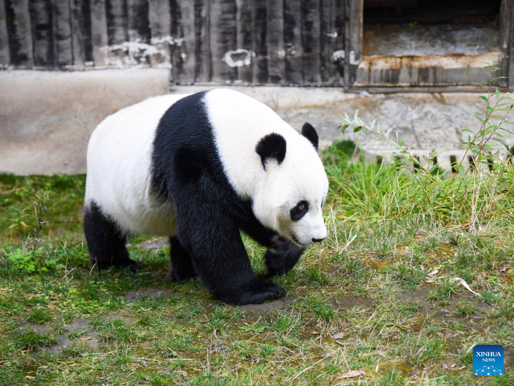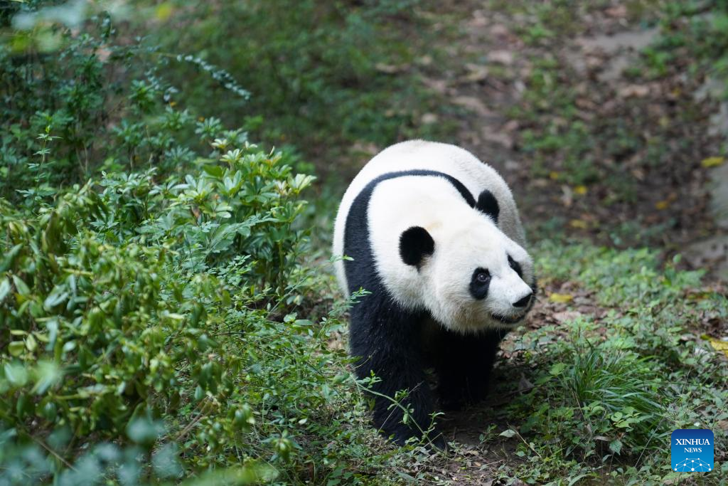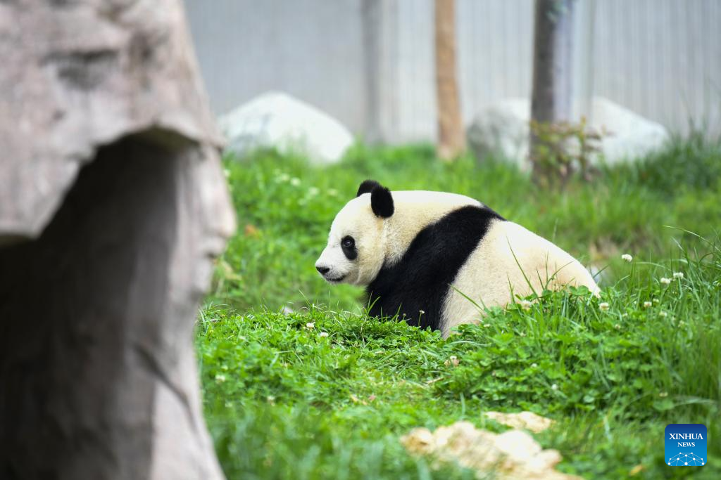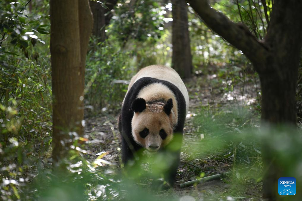 Giant panda Sheng Yi is pictured at the Shenshuping giant panda base of Wolong National Nature Reserve in southwest China's Sichuan Province, April 16, 2024. Sheng Yi, female, was born at Zoo Negara, the National Zoo of Malaysia, on May 31, 2021. (Xinhua/Xu Bingjie)