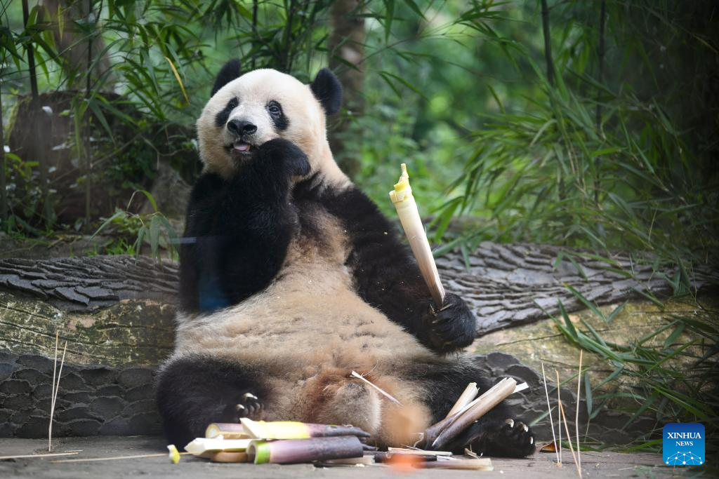 Giant panda Mei Sheng eats bamboo shoots at the Bifengxia Panda Base of the China Conservation and Research Center for the Giant Panda in Ya'an, southwest China's Sichuan Province, June 26, 2024. Mei Sheng, male, was born at the San Diego Zoo in the United States on Aug. 19, 2003. (Xinhua/Xu Bingjie)