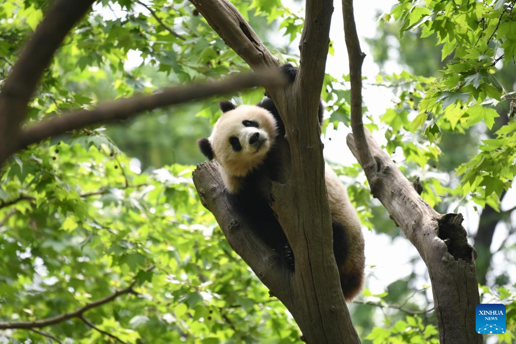 Giant panda Le Le frolics on a tree branch at the Dujiangyan base of the China Conservation and Research Center for the Giant Panda in Chengdu, southwest China's Sichuan Province, April 19, 2024. Le Le, male, was born at the River Wonders wildlife park in Singapore on Aug. 14, 2021. (Xinhua/Xu Bingjie)