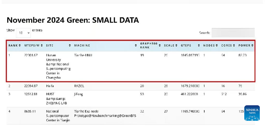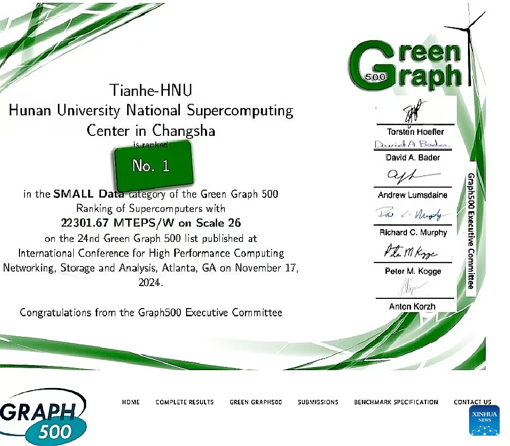 CHANGSHA, Nov. 25 (Xinhua) -- China's new generation Tianhe supercomputer has won first place in the latest Small Data Green Graph 500 ranking, according to the Changsha national supercomputer center in central China's Hunan Province.