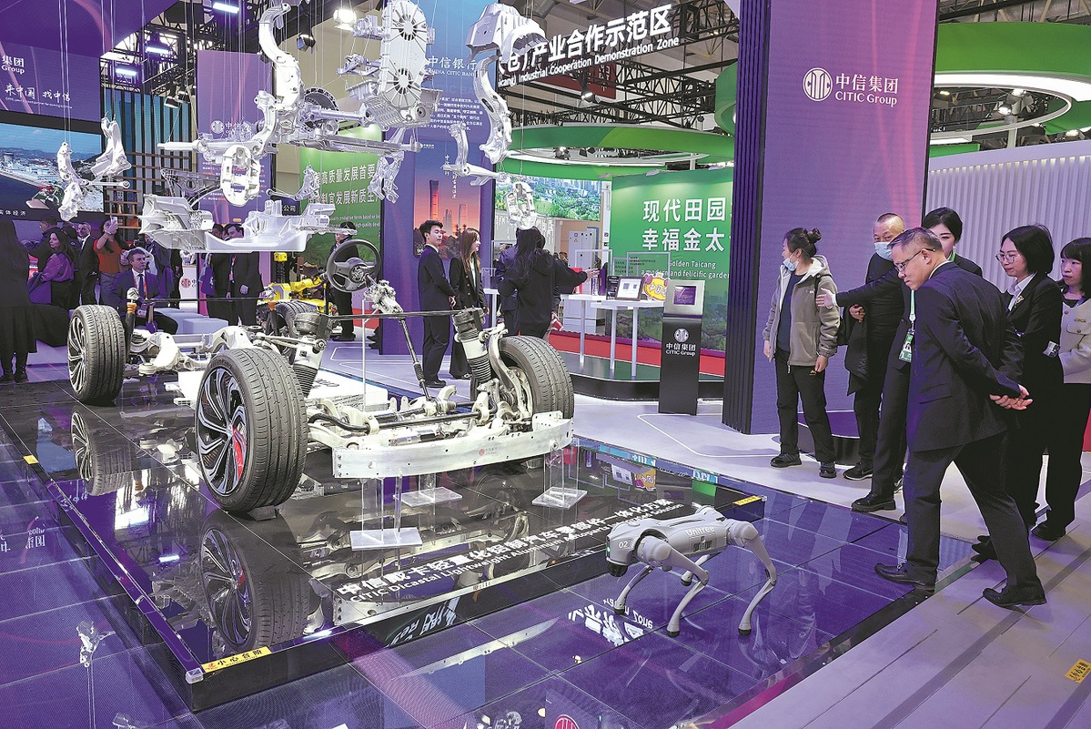 Visitors view products displayed at a booth of CITIC Group during the second China International Supply Chain Expo, which opened on Tuesday and runs through Saturday in Beijing. The expo, with the theme "Connecting the World for a Shared Future", has gathered global industry leaders and experts and aims to promote global cooperation in industrial and supply chains. (WANG JING/CHINA DAILY)