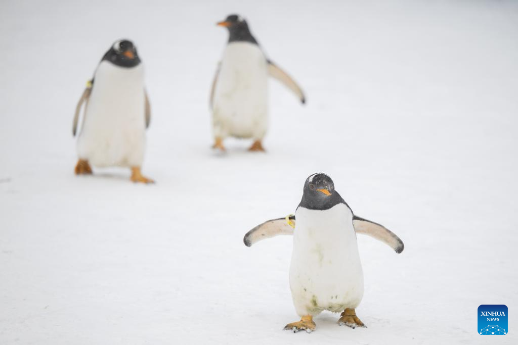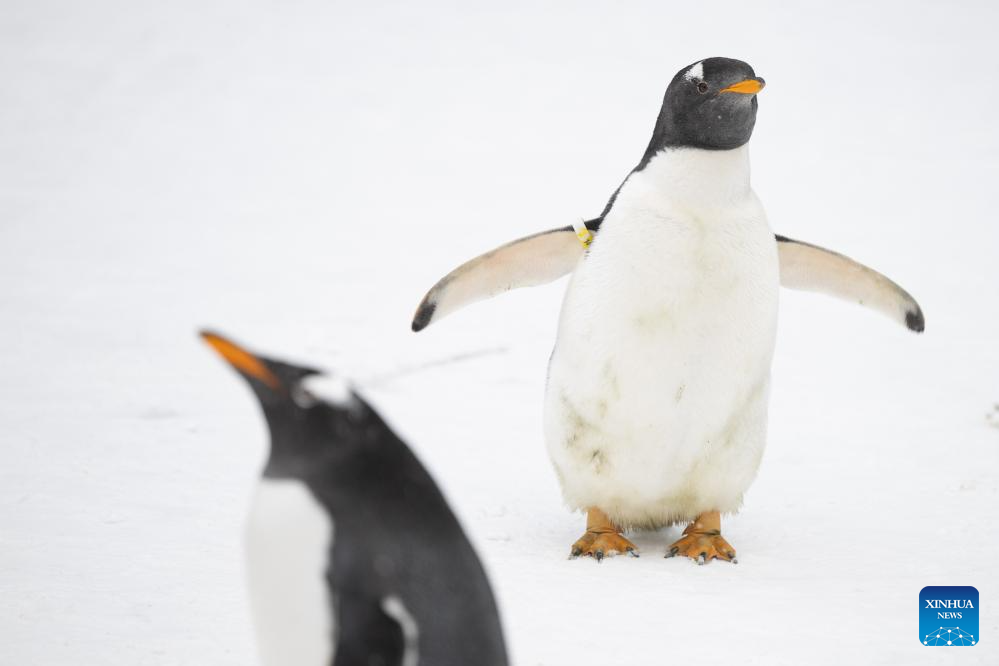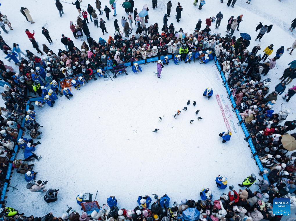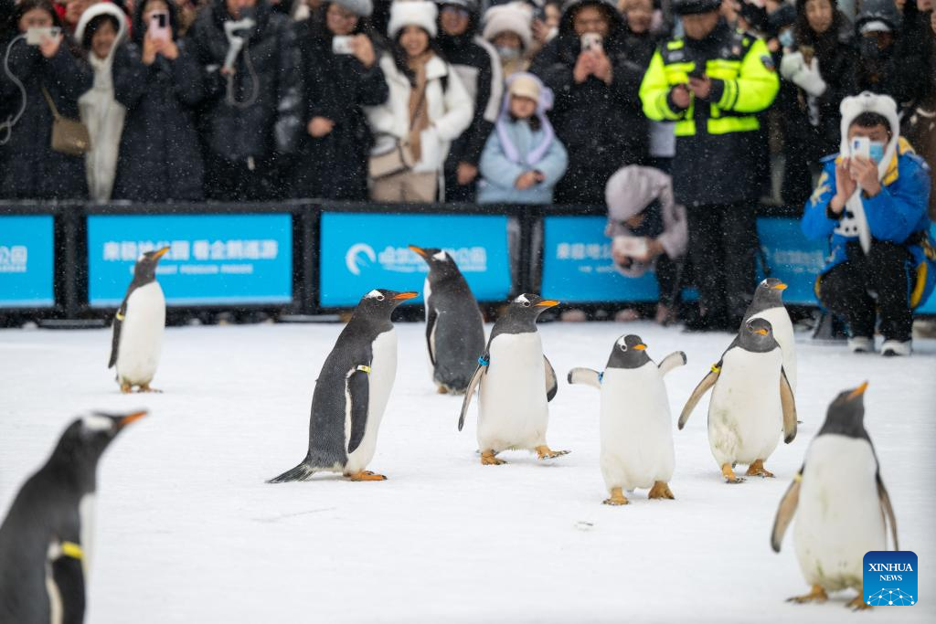 Penguins take part in a parade in Harbin, northeast China's Heilongjiang Province, Nov. 26, 2024. Ten penguins of the Harbin Polarpark were taken out for a parade in the city on Tuesday. (Xinhua/Zhang Tao)