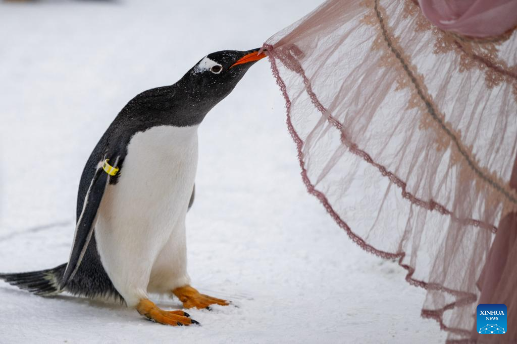A penguin interacts with a tourist in Harbin, northeast China's Heilongjiang Province, Nov. 26, 2024. Ten penguins of the Harbin Polarpark were taken out for a parade in the city on Tuesday. (Xinhua/Zhang Tao)