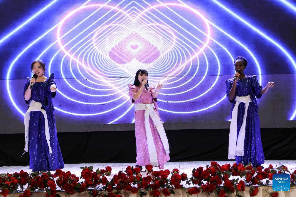 Students and teachers perform during the 10th anniversary celebration of Confucius Institute at Makerere University in Kampala, Uganda, on Nov. 25, 2024. The Confucius Institute at Makerere University, Uganda's premier institution, celebrated its 10th anniversary Monday, marking a decade of fostering cultural and linguistic exchanges between China and Uganda. (Photo by Hajarah Nalwadda/Xinhua)