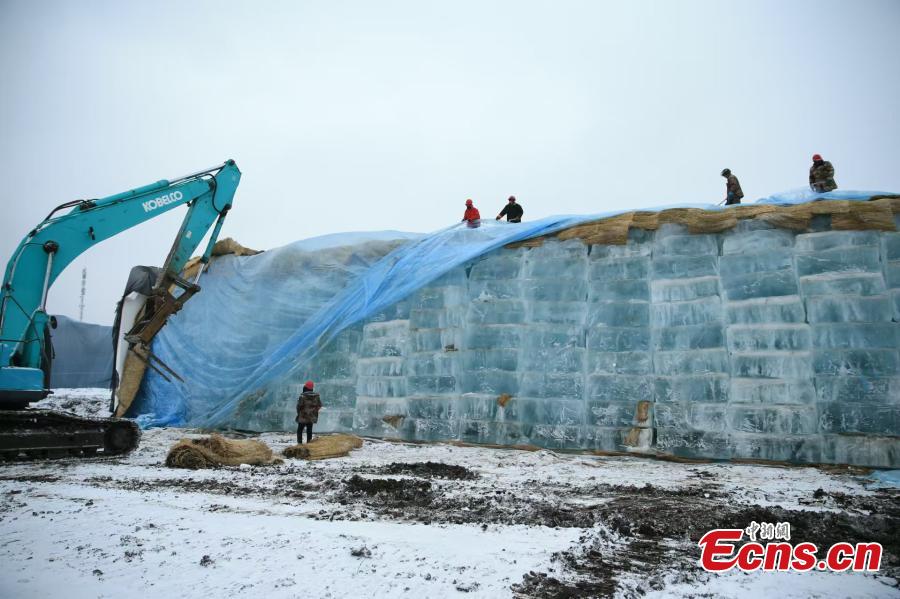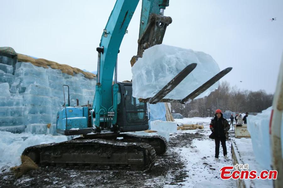 A machine removes ice cubes ahead of the construction of the 26th Harbin Ice-Snow World in Harbin, northeast China's Heilongjiang Province, Nov. 26, 2024. (China News Service/Yu Kun)