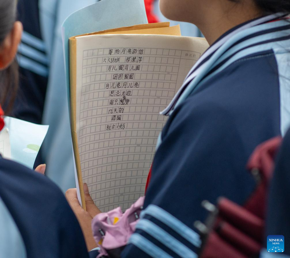 A student holds a composition book with a poem written on it at the Mangshui Town Central School in Mangshui Town of Changning County, Baoshan City, southwest China's Yunnan Province, Sept. 12, 2024. (Xinhua/Jiang Wenyao)