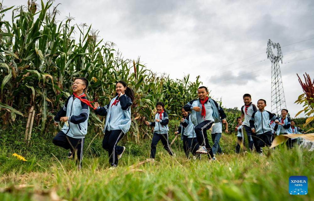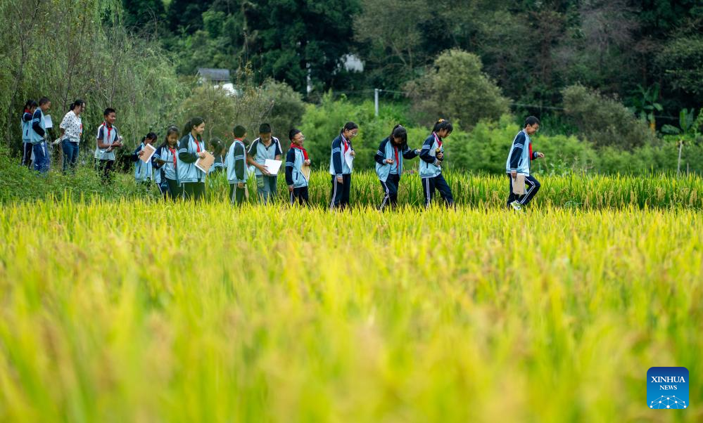 Students of the Mangshui Town Central School walk into a grain field to take their poetry class in Mangshui Town of Changning County, Baoshan City, southwest China's Yunnan Province, Sept. 12, 2024. (Xinhua/Jiang Wenyao)