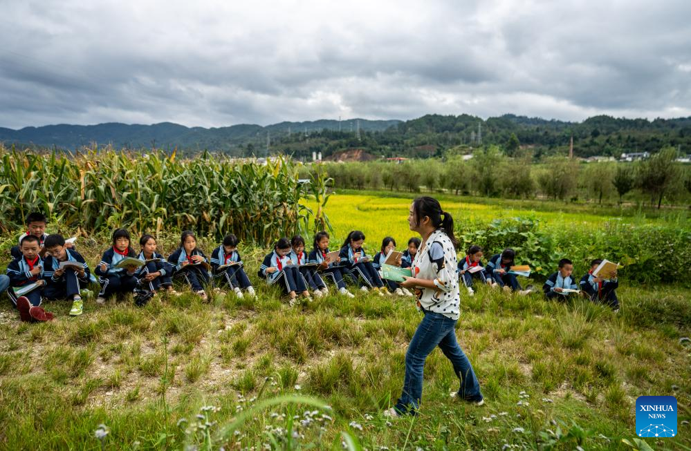 Before this year's Mid-Autumn Festival, a cherished occasion for family reunions, some students of the Mangshui Town Central School had their first poetry class of the autumn semester in the fields, under the guidance of their teacher, Yang Deli.