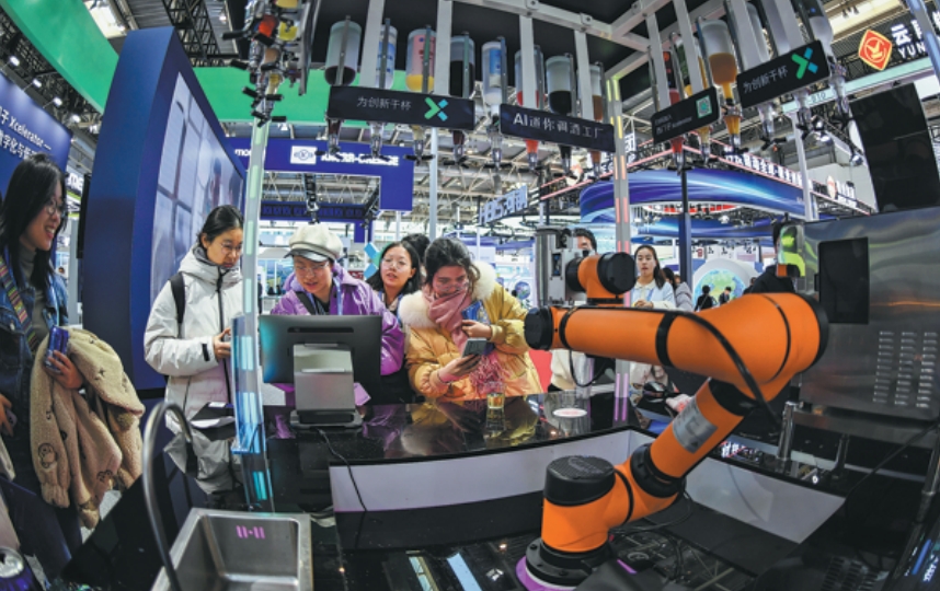 People check out an AI-driven bartending system at the Siemens booth in the advanced manufacturing chain exhibition area of the second China International Supply Chain Expo in Beijing on Wednesday. (ZHANG HAOFU/XINHUA)