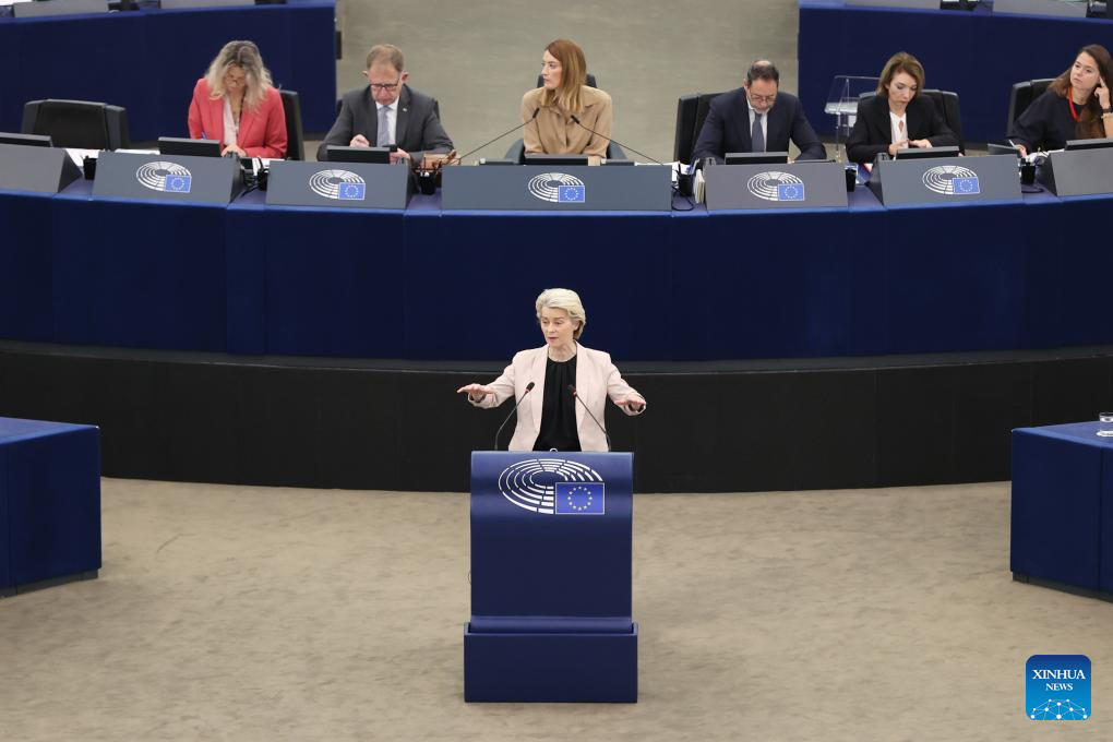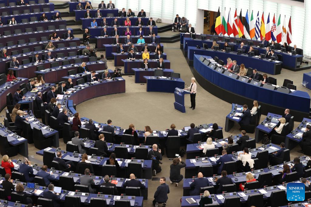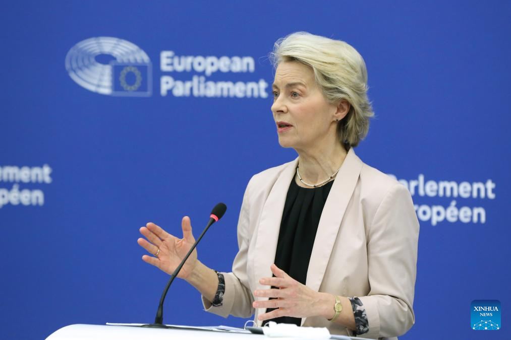 European Commission President Ursula von der Leyen makes a statement at the headquarters of European Parliament in Strasbourg, France, Nov. 27, 2024. (Xinhua/Zhao Dingzhe)