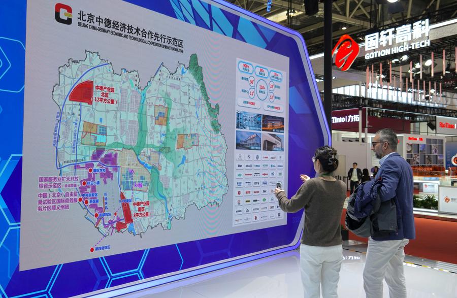 A visitor talks with a staff member at the booth of Beijing China-Germany Economic and Technological Cooperation Demonstration Zone at the second China International Supply Chain Expo (CISCE) in Beijing, capital of China, Nov. 28, 2024. (Xinhua/Xiao Ennan)