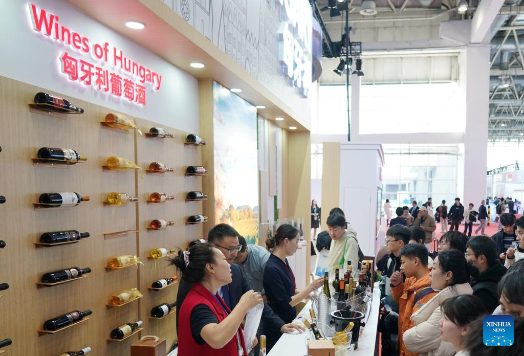 People taste wines at the Hungary Pavilion of the second China International Supply Chain Expo in Beijing, China, Nov. 27, 2024. This year's expo has Hungary as its guest country of honor. The Hungary Pavilion showcases Hungary's leading industries, unique resources, cultural heritage, beautiful landscapes and national brand image. (Xinhua/Zhang Chenlin)