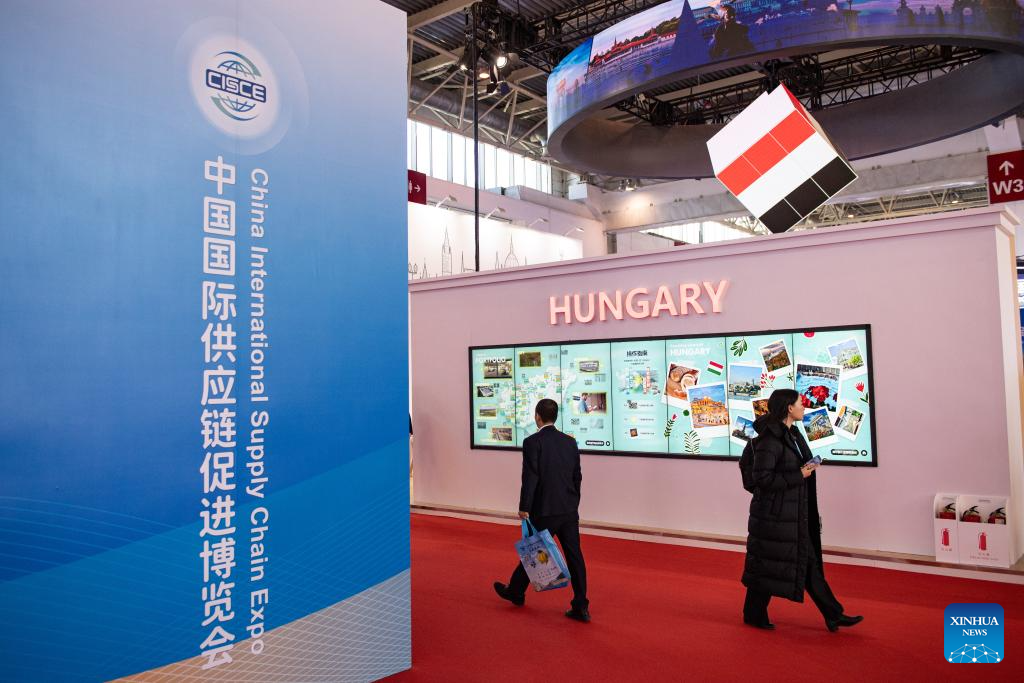 People walk past the Hungary Pavilion of the second China International Supply Chain Expo in Beijing, China, Nov. 28, 2024. This year's expo has Hungary as its guest country of honor. The Hungary Pavilion showcases Hungary's leading industries, unique resources, cultural heritage, beautiful landscapes and national brand image. (Xinhua/Chen Zhonghao)