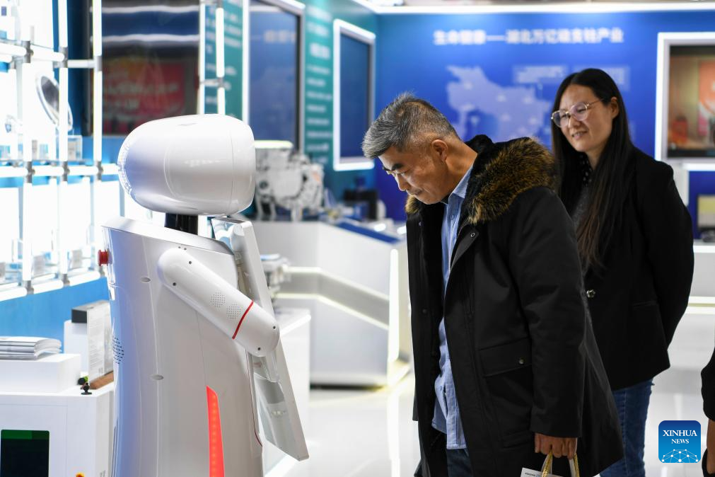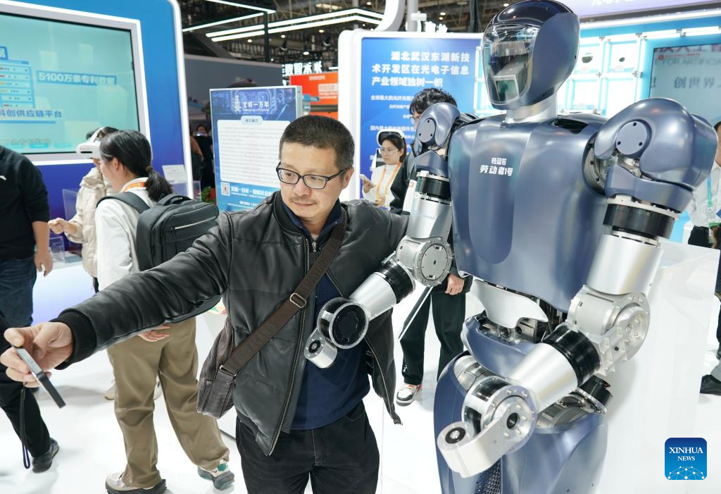 A visitor interacts with a robot at the exhibition area of central China's Hubei Province of the second China International Supply Chain Expo in Beijing, China, Nov. 27, 2024. As the province of honor for this year's expo, Hubei Province has invited 28 of its enterprises which showcased more than 70 exhibits during the event. (Xinhua/Zhang Haofu)