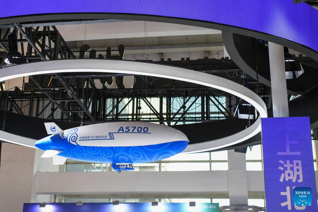 A model of AS700 airship is displayed at the exhibition area of central China's Hubei Province of the second China International Supply Chain Expo in Beijing, China, Nov. 27, 2024. As the province of honor for this year's expo, Hubei Province has invited 28 of its enterprises which showcased more than 70 exhibits during the event. (Xinhua/Zhang Haofu)